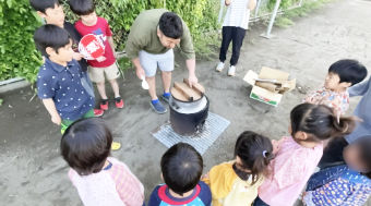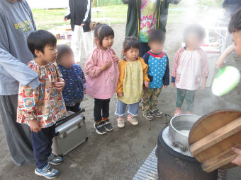 初めての子どももいて苦労しながら無事に寝床は完成しました。夕食はカレーライス。目の前で土鍋のご飯が炊けていくのを見るのは初めてで、みんなわくわく。