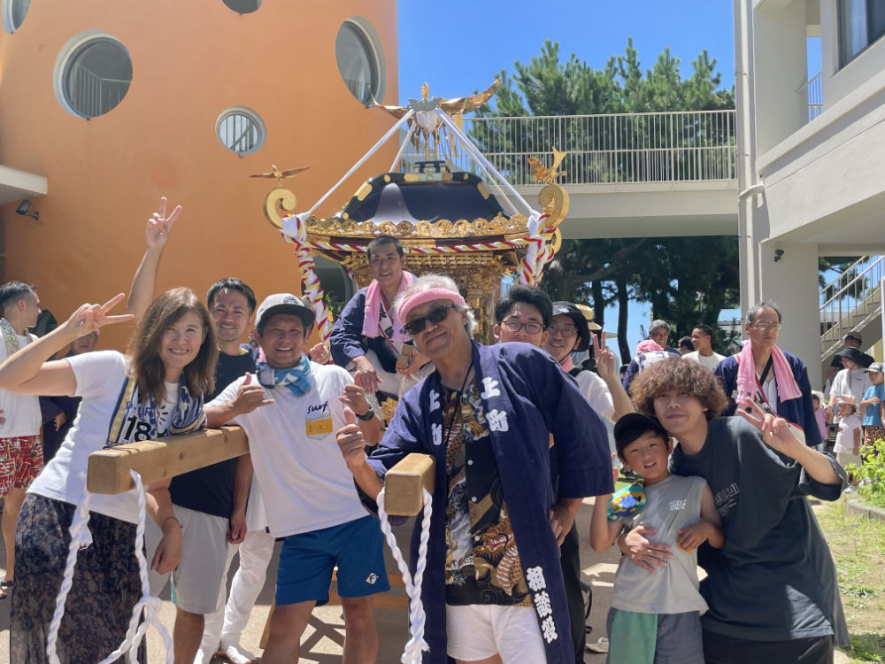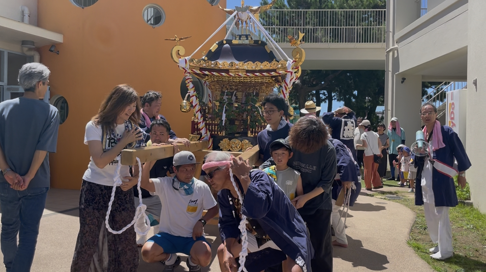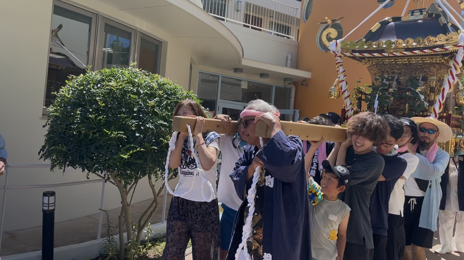 御旅所として、園内で一休みの後はみんなで協力してきらびやかな大人神輿を担がせて頂きます。日本の伝統、夏の風物詩をご提供いただくことに感謝いたします。こうして毎年、子どもたちの思い出が豊かな彩で残されていっています。