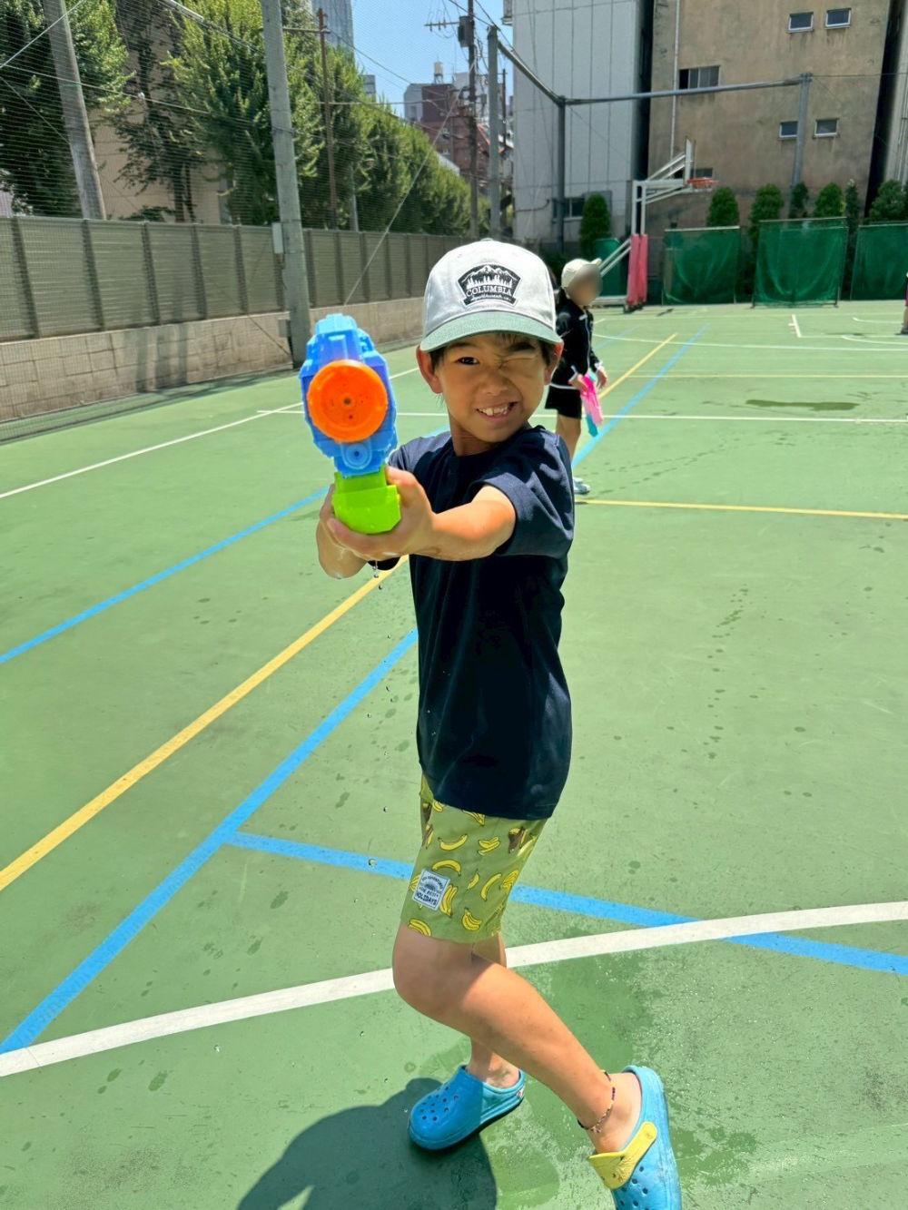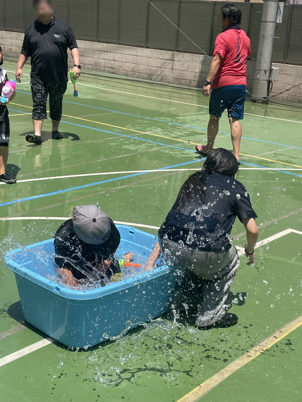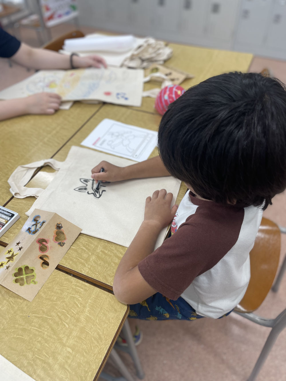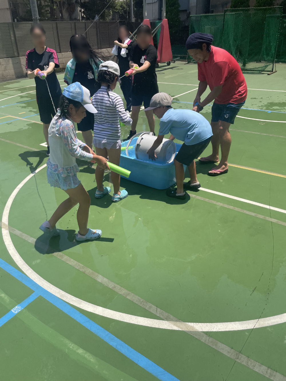 午前はエコバッグ作りやプラ板キーホルダーを作るグループと、校庭で水遊びをするグループに分かれて楽しみました。
