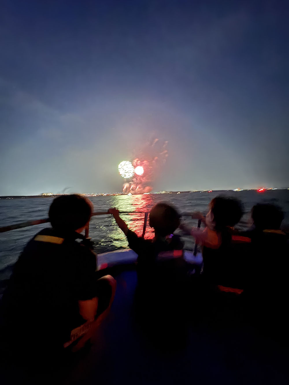 花火が始まると子どもたちも大興奮!夜空と水面に映り浮かぶ花火の色合いがとても綺麗で、忘れられない夏の思い出となりました。