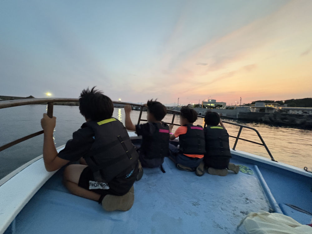 出発する前から子どもたちもウキウキ、ワクワク!船が出港してからは徐々に景色が変わり夕暮れを迎える山間を海から眺め、船が波を越える度に揺れる様に感動していました。