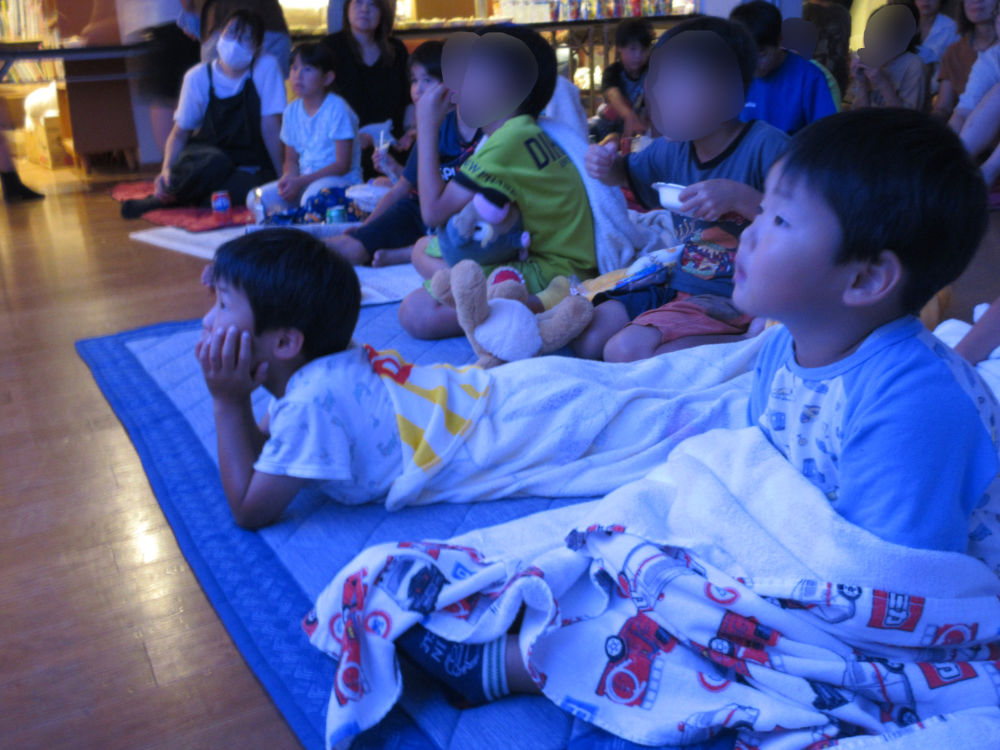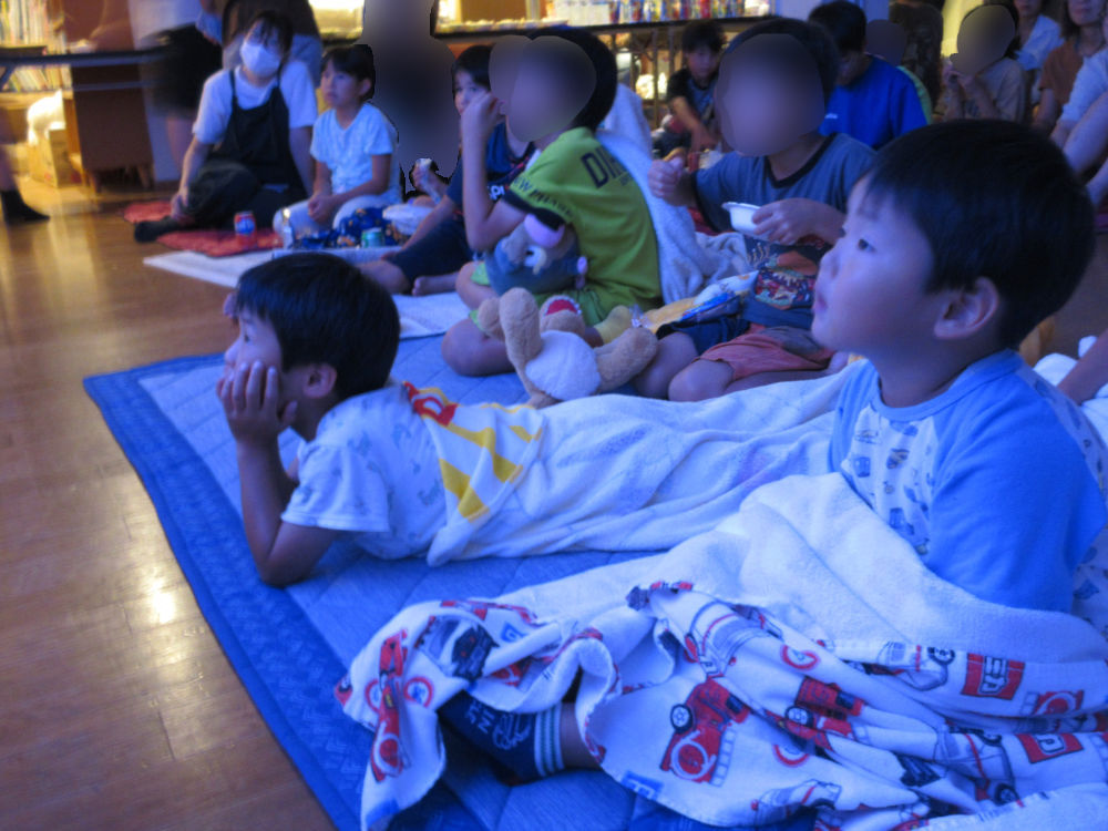 学園の子どもだけでなく、上町地区の子ども会のお友だちも一緒に、ポップコーンやジュースを食べながらフロアでリラックスして一緒に大きな画面に映る、迫力満点の映像を楽しんでいました。