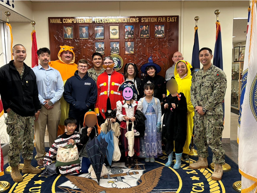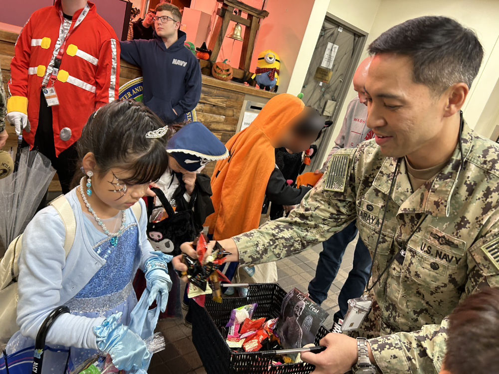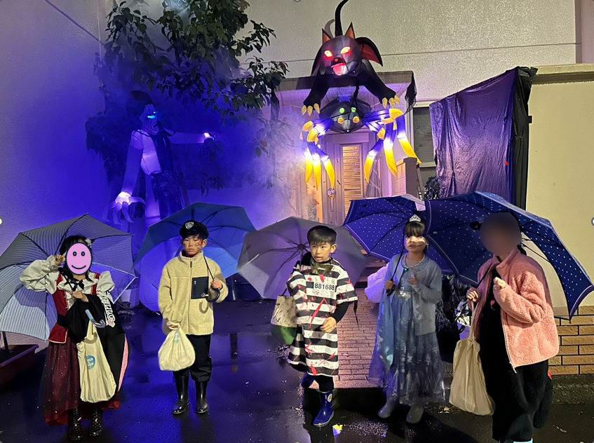 あいにくの雨でしたが、金曜日ということもあって基地内も賑わっており、仮装はもちろんのこと家の装飾などに子どもたちも「凄いね!」と驚いていました。始めは緊張して顔が強張っていましたが、お宅を一軒一軒周り、英語で合言葉を言うと、笑顔でお菓子をたくさん頂き、大満足でした。