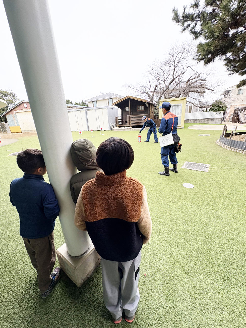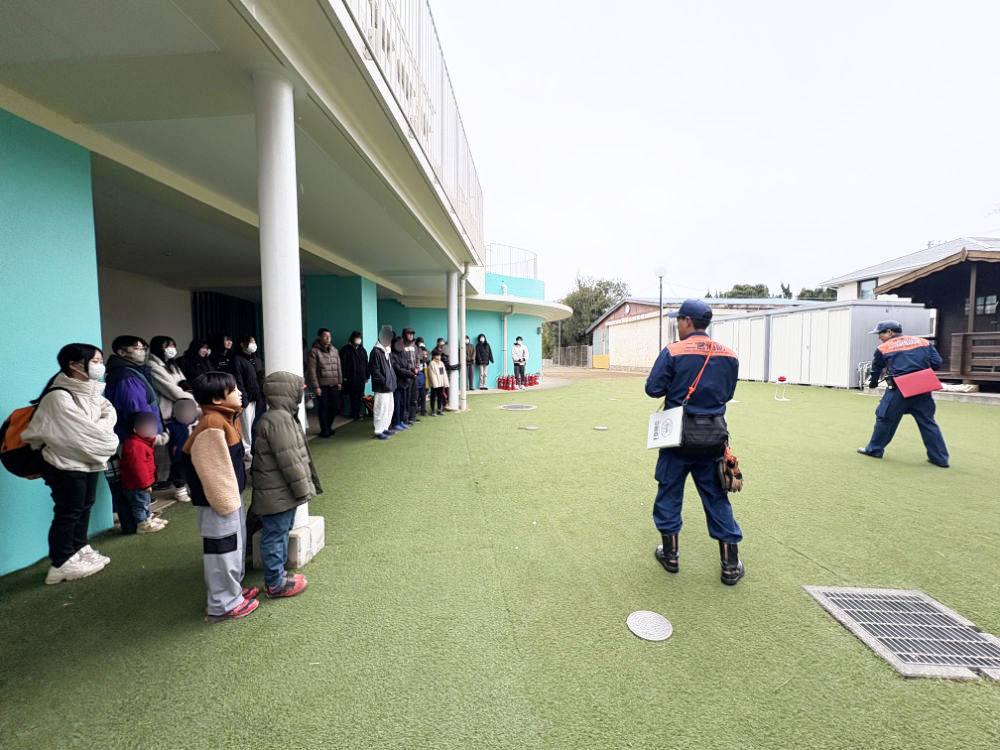 今回の避難訓練は火災を想定した訓練で、消防署の方にチェックして頂きました。事前説明を参考にしながらハンカチで口を押さえたり、姿勢を低くする意識を持って、落ち着いて避難することができた子どもも多くいました。