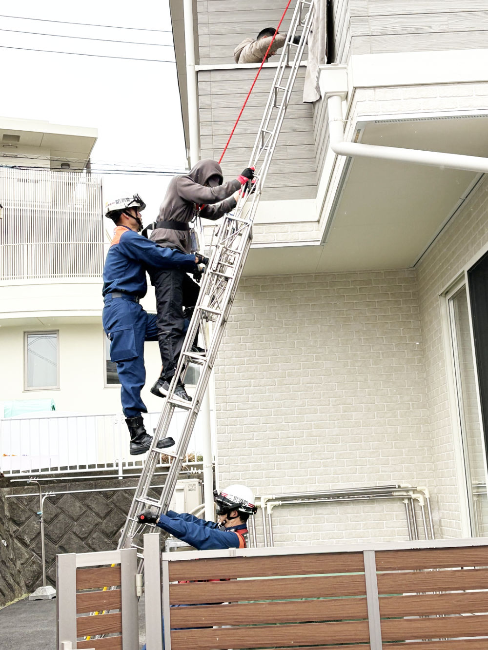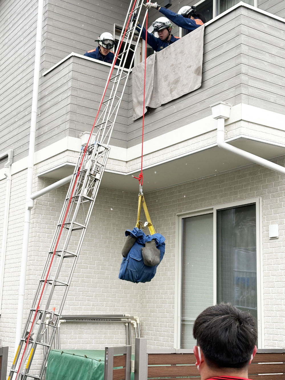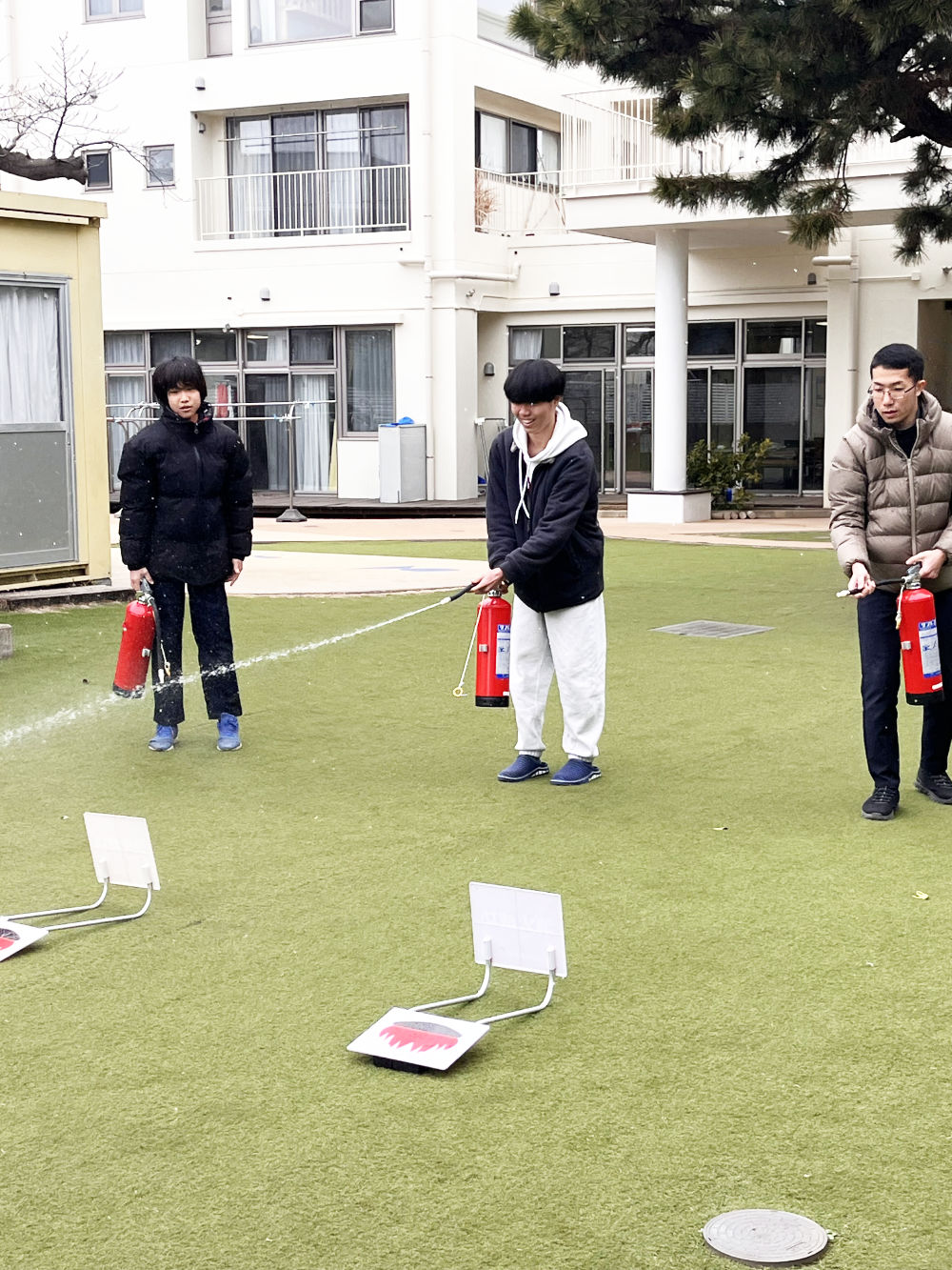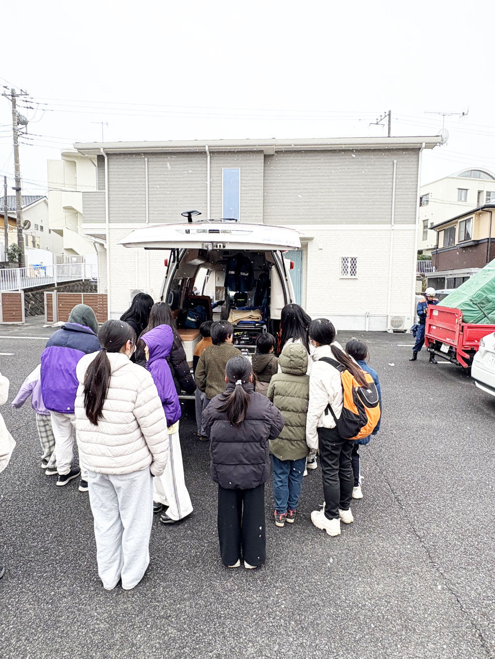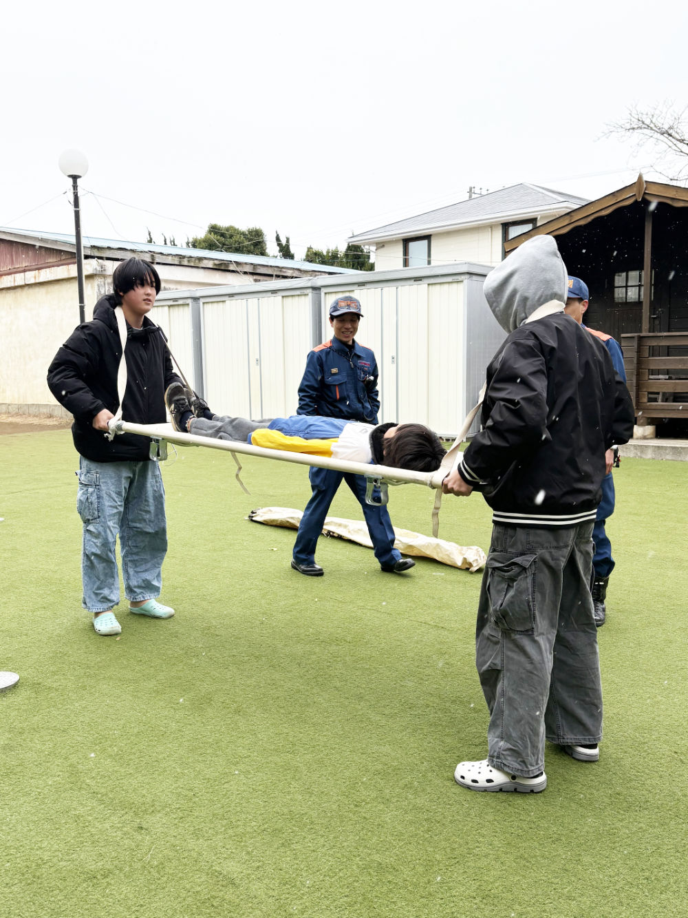「災害はいつやって来るか選べない」という言葉通り、雪が降る寒い中での訓練となりましたが、消防訓練では消防署員の方のお話をしっかりと聞き、消火器訓練や担架の使い方では誰一人茶化すことなく、また、二階からの救出訓練見学などにも真剣に説明に耳を傾けて、訓練に取り組んでいました。長い時間でしたが、最後まで頑張る姿が見られました。