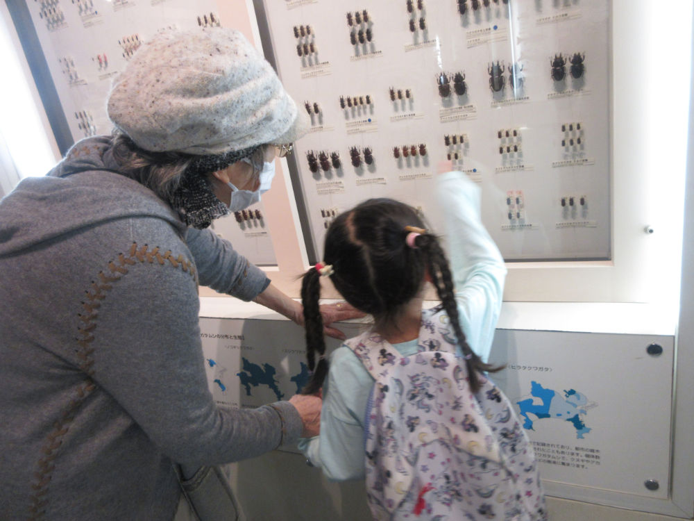博物館では、子ども一人ひとりに町ボランティアさんについてもらい、自由に一緒に見て回りました。みんな展示物に目を輝かせ、動物や昆虫の展示を一つずつじっくりと見ている子ども、色々な場所へ興味を示し、展示から展示へ見て回る子どもなど様々でした。